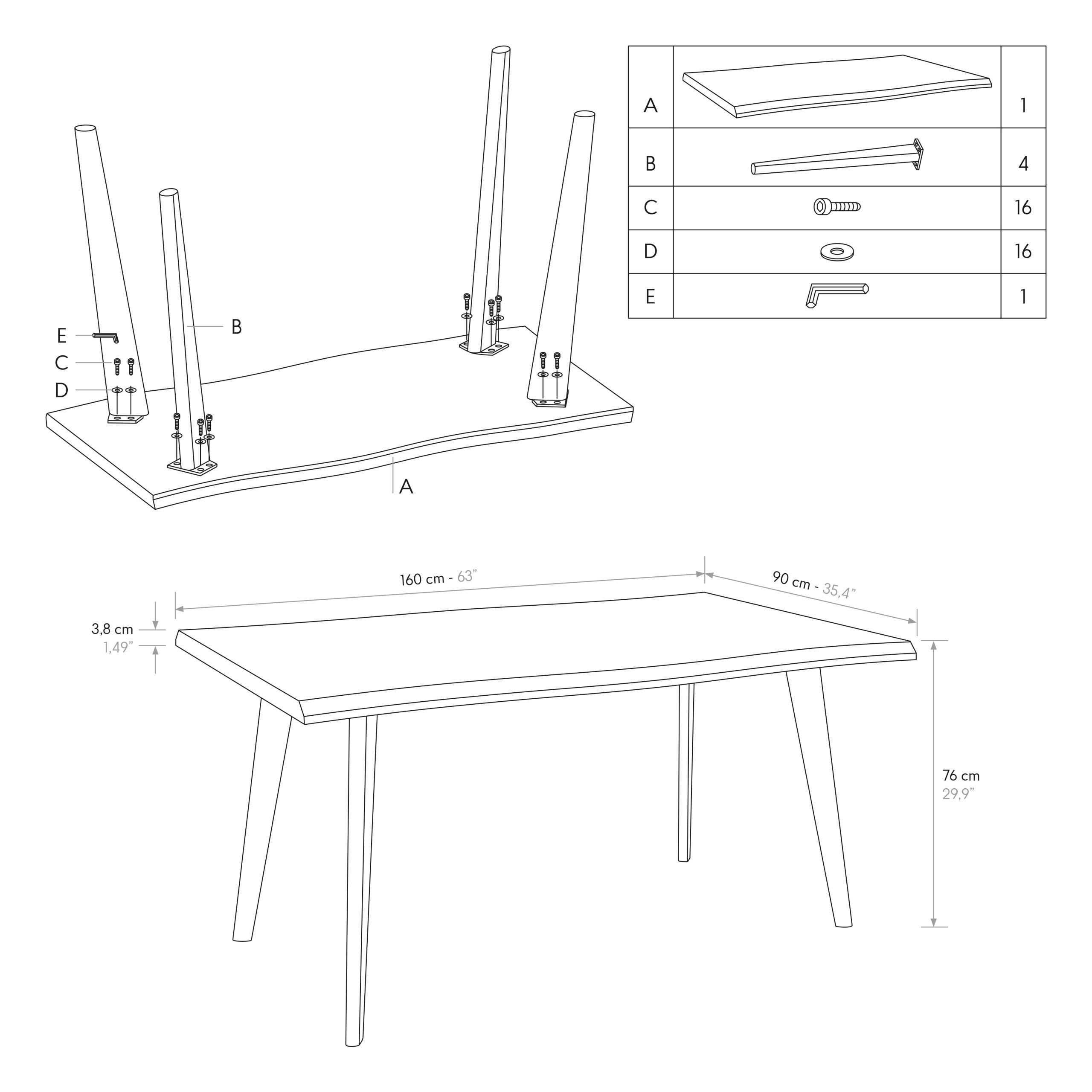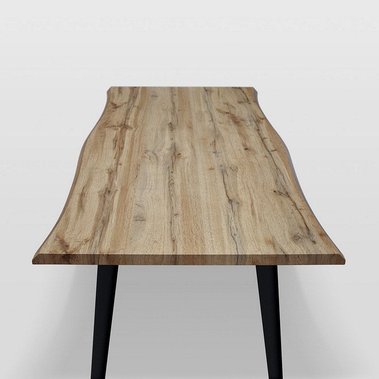 Le sue gambe, in metallo verniciato nero, sono leggermente oblique e conferiscono stabilità e un tocco di modernità al tavolo. Il piano invece, realizzato con una parte interna in mdf e rivestito in carta 3D effetto rovere rustico, aggiunge calore e carattere all’ambiente circostante.