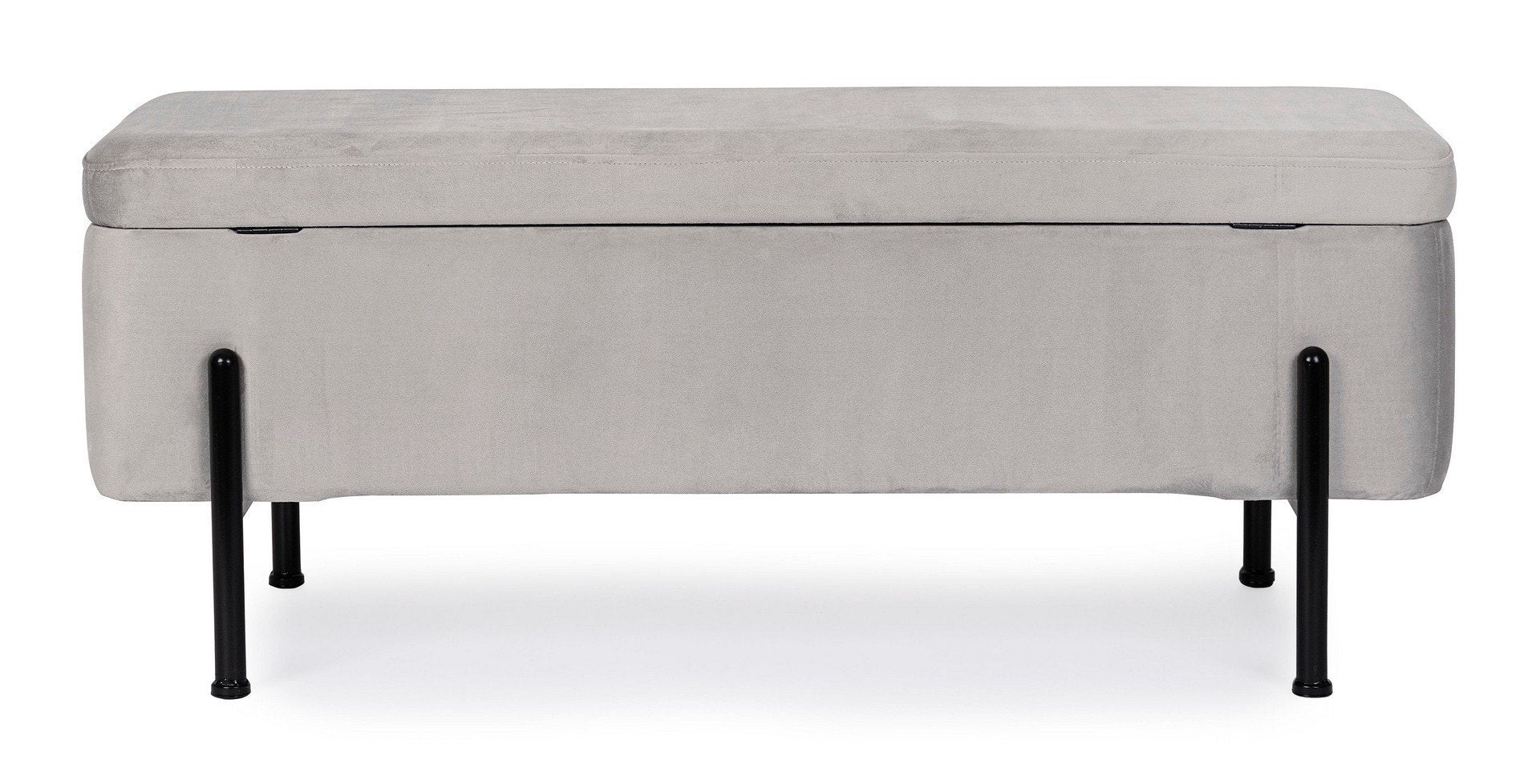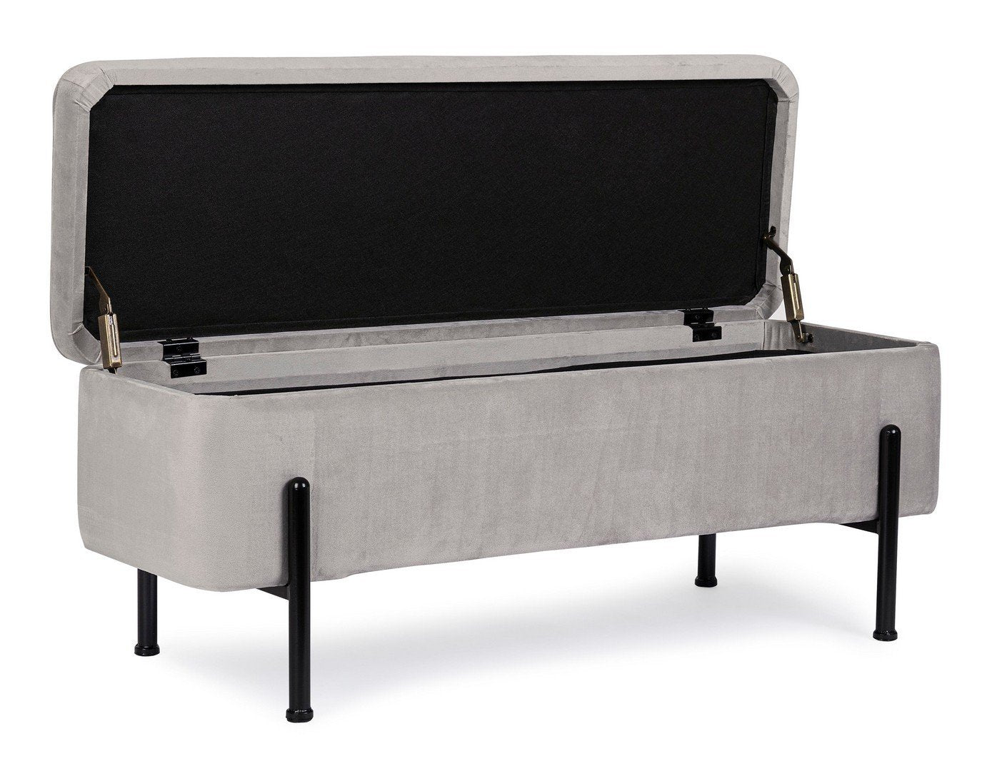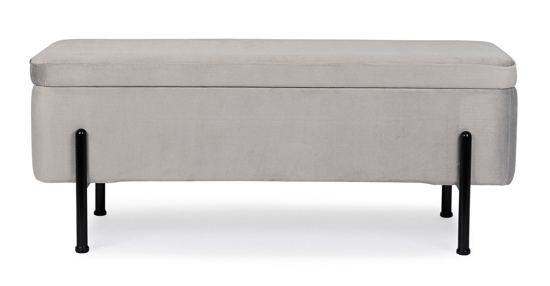 Panca contenitore IRINA coniuga la versatilità a uno stile elegante e raffinato. La sua struttura è in legno nobilitato, rivestimento in poliestere effetto velluto, le gambe in acciaio verniciato nero. Puoi utilizzare la panca KIRA come complemento d’arredo oppure trasformarla in un comodo contenitore-scrigno alzando il coperchio da un lato. Ideale per l’ingresso di casa, il soggiorno e la camera da letto oppure per studi professionali e uffici.