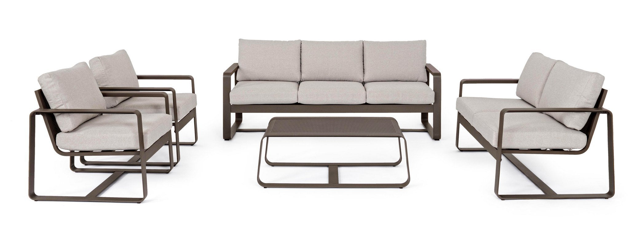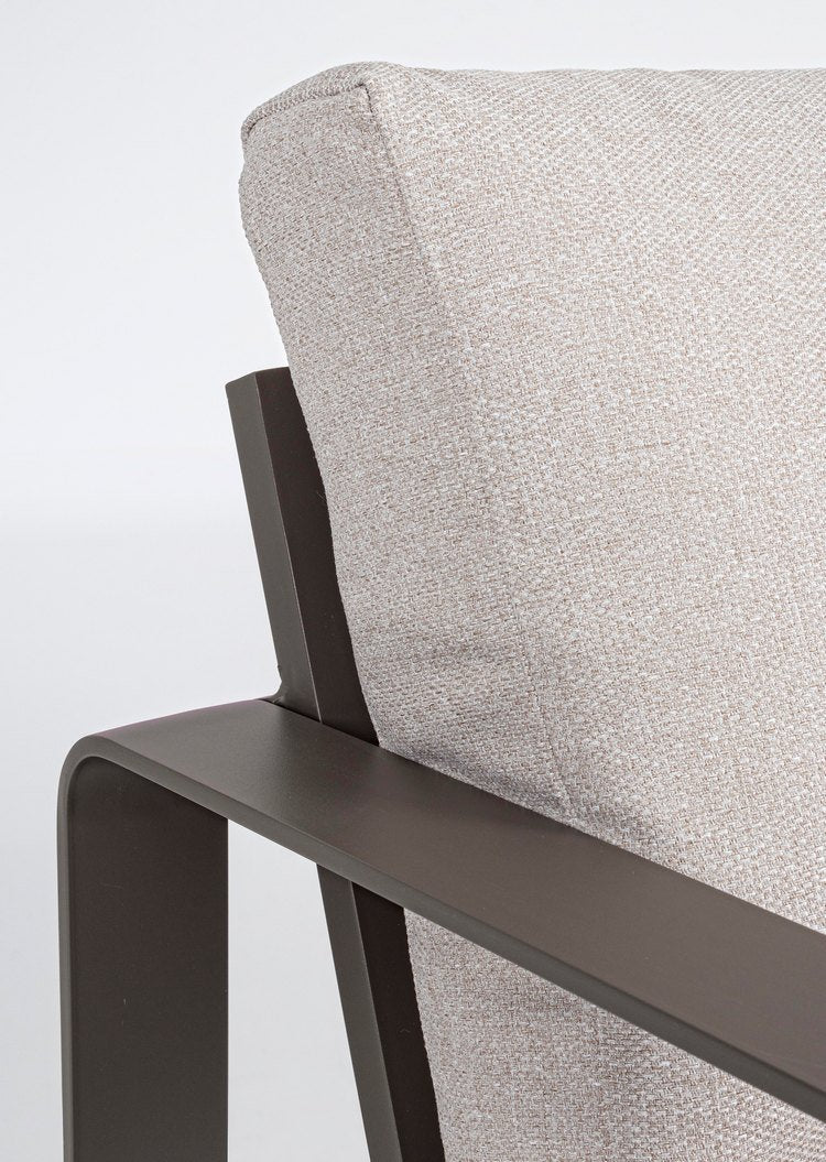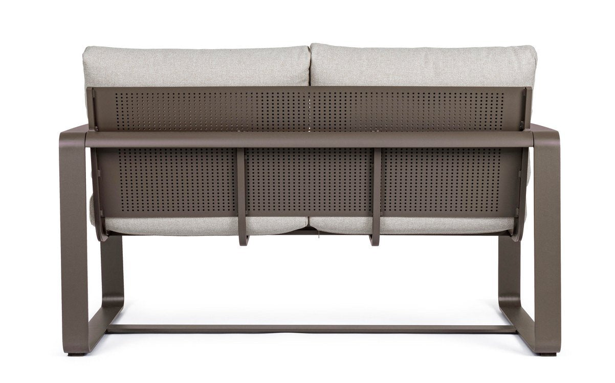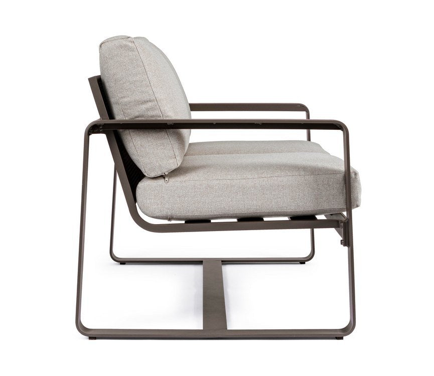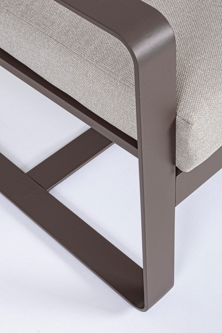 La struttura geometrica in alluminio caffè, con angoli arrotondati, sorregge una seduta estremamente comoda costituita da cuscini morbidi color tortora, posizionati sia nella parte seduta che nello schienale. Entrambi sono interamente sfoderabili e realizzati con tessuto idrorepellente perfetti quindi per gli spazi esterni e facili da pulire.