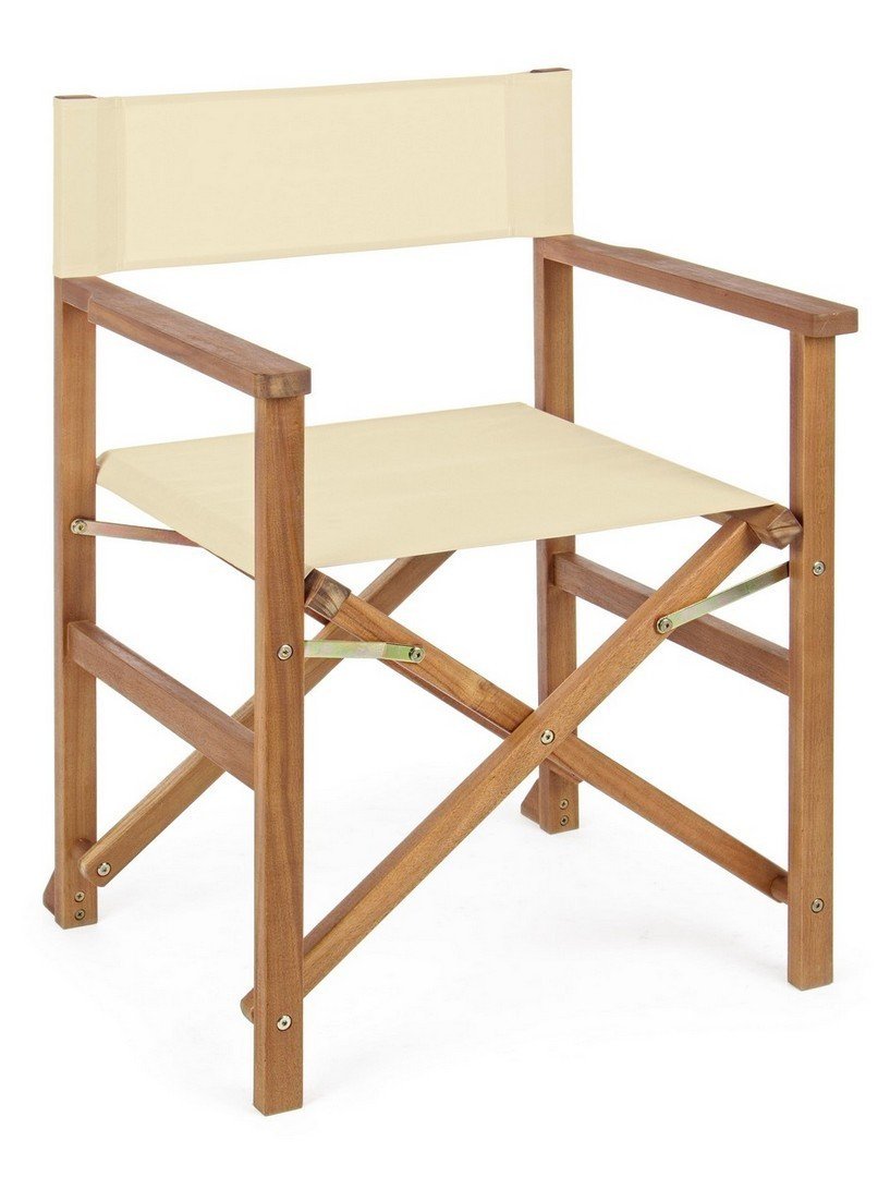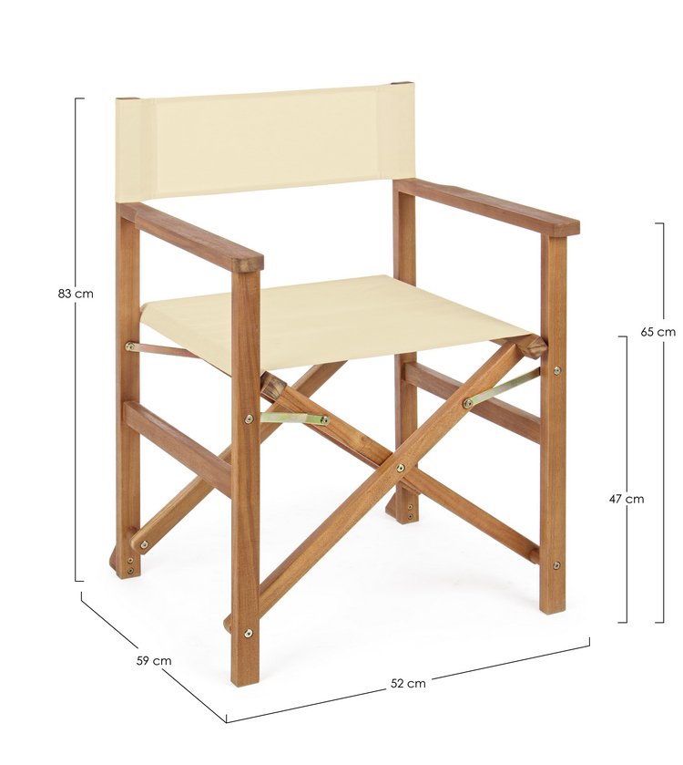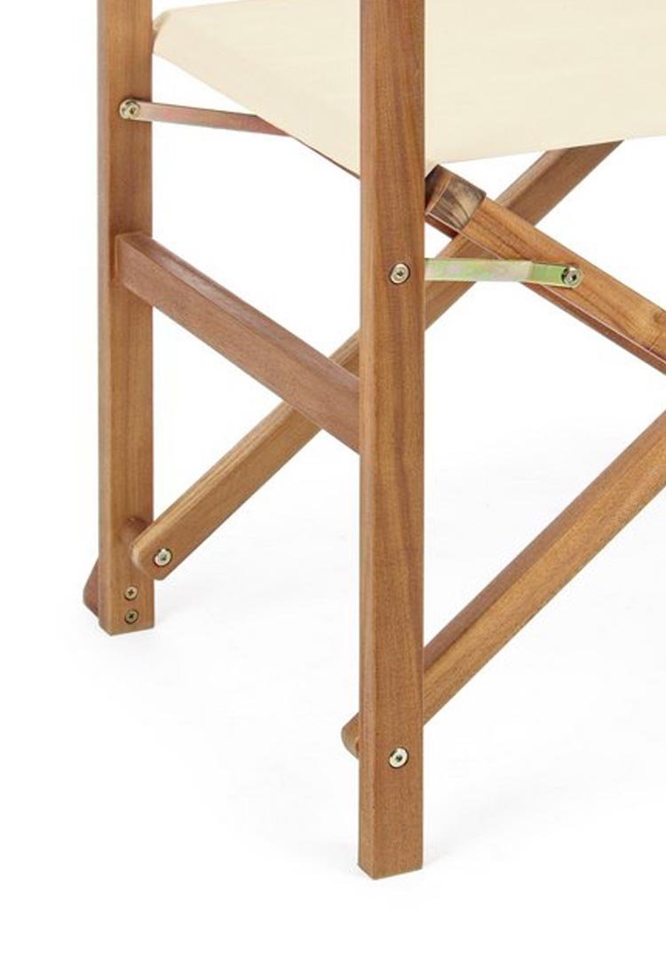 La struttura è in legno di acacia con finitura ad olio, lo schienale e la seduta sono in tessuto poliestere. In caso di uso esterno si consiglia di evitare la prolungata esposizione al sole e alle intemperie.