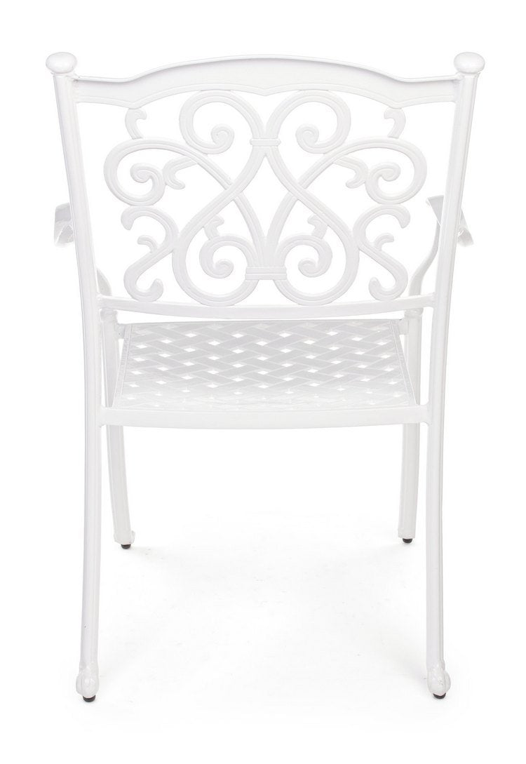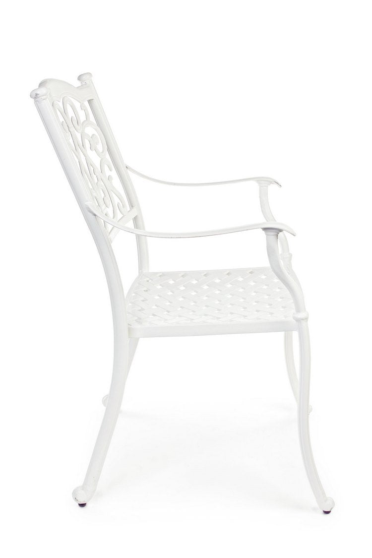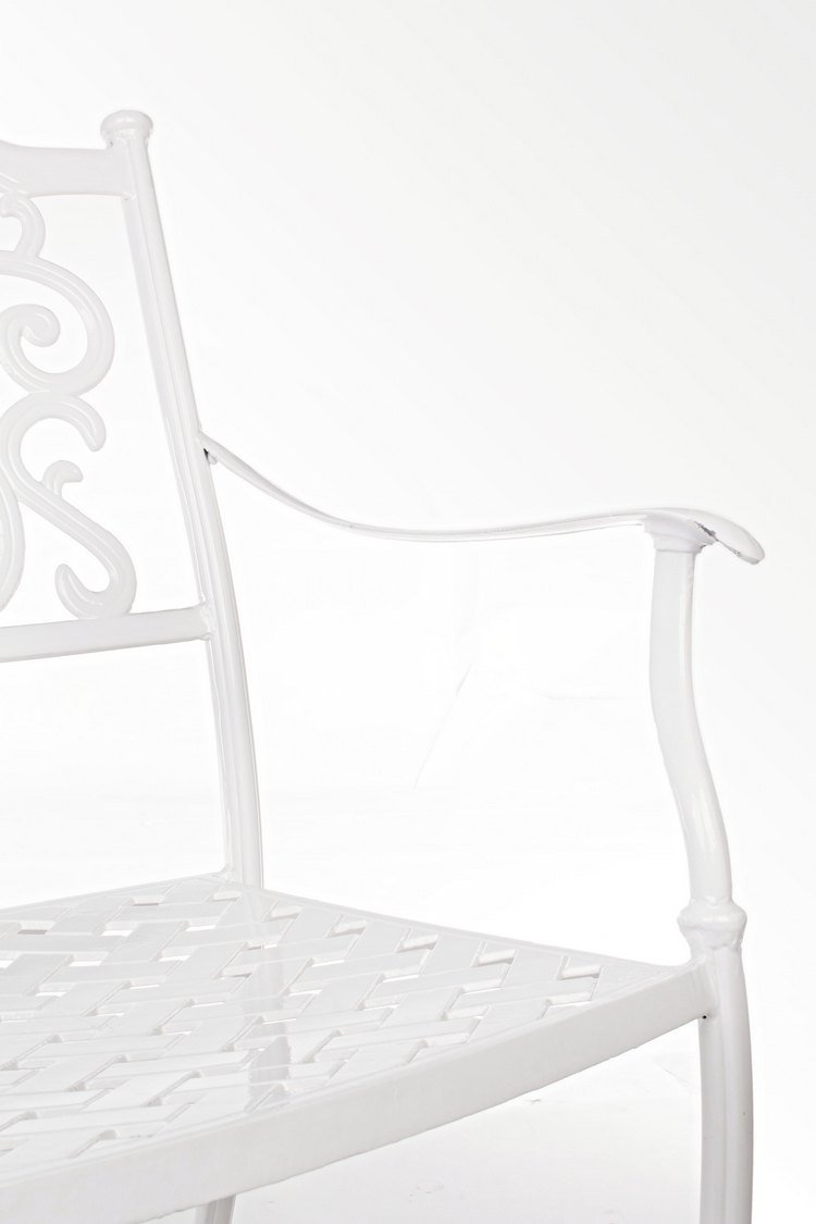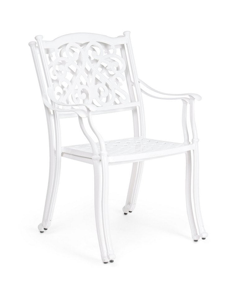Ciascuna sedia ha una struttura dotata di braccioli ed è realizzata in alluminio pressofuso verniciato a polvere, di colore bianco effetto lucido.