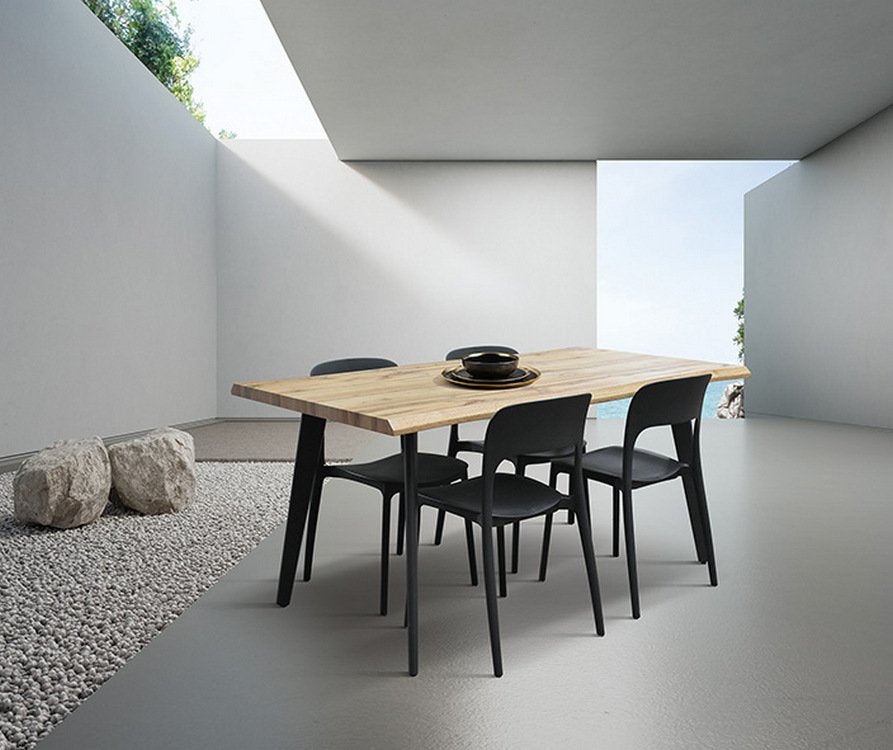 Le sue gambe, in metallo verniciato nero, sono leggermente oblique e conferiscono stabilità e un tocco di modernità al tavolo. Il piano invece, realizzato con una parte interna in mdf e rivestito in carta 3D effetto rovere rustico, aggiunge calore e carattere all’ambiente circostante.