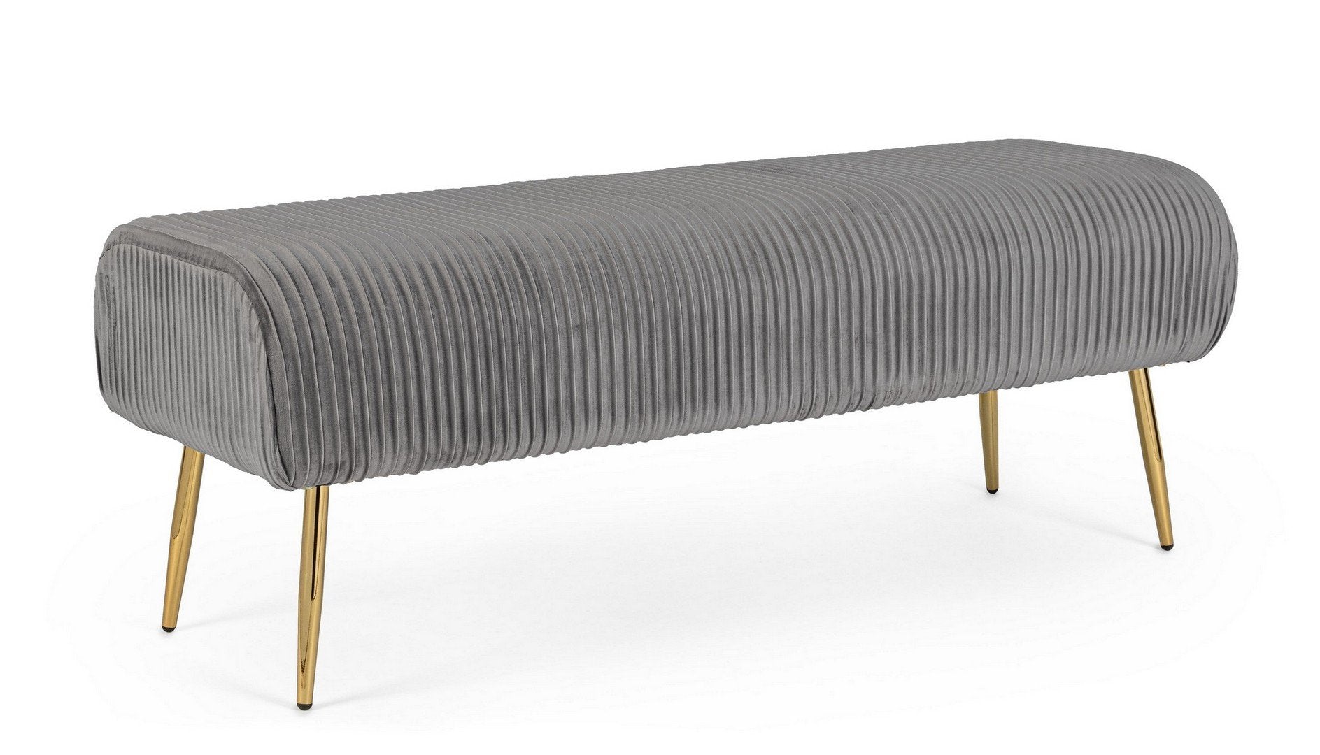 Panca SELENA grigio con struttura in legno nobilitato, imbottitura rivestita in stoffa di poliestere 100% effetto velluto, gambe in acciaio verniciato a polvere epossidica.