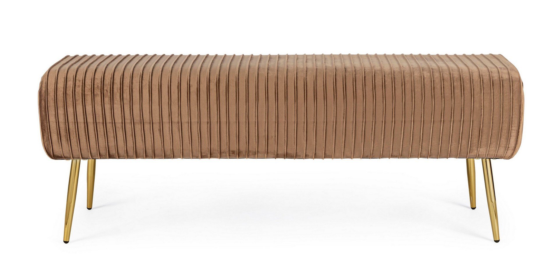 Panca SELENA colore bronzo con struttura in legno nobilitato, imbottitura rivestita in stoffa di poliestere 100% effetto velluto, gambe in acciaio verniciato a polvere epossidica.