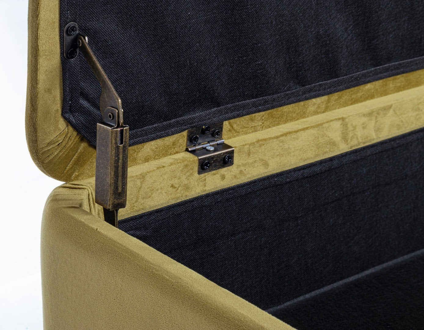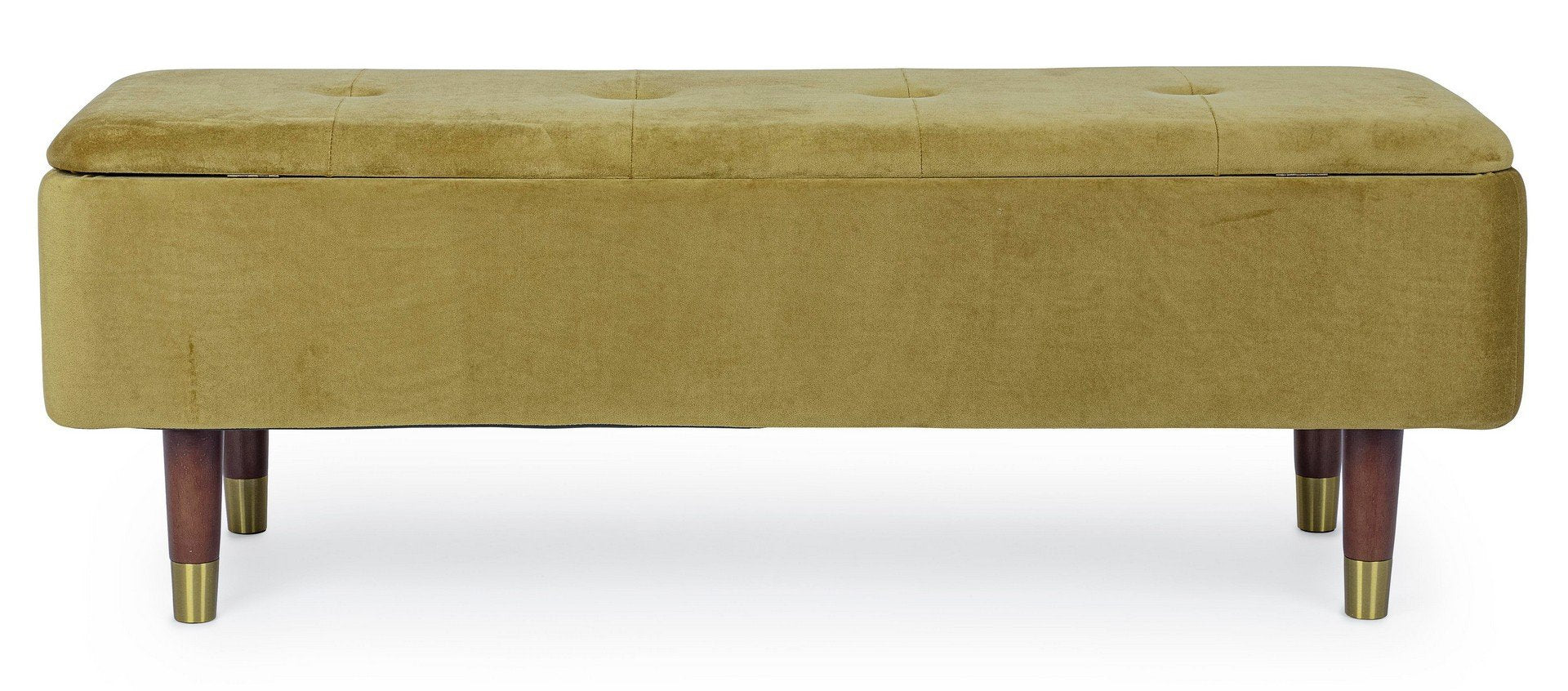 Panca contenitore KIRA coniuga la versatilità a uno stile elegante e raffinato. La sua struttura è in legno nobilitato, rivestimento in poliestere effetto velluto, le gambe sono in legno con la parte finale in acciaio verniciato color oro. Puoi utilizzare la panca KIRA come complemento d’arredo oppure trasformarla in un comodo contenitore-scrigno alzando il coperchio da un lato. Ideale per l’ingresso di casa, il soggiorno e la camera da letto oppure per studi professionali e uffici.