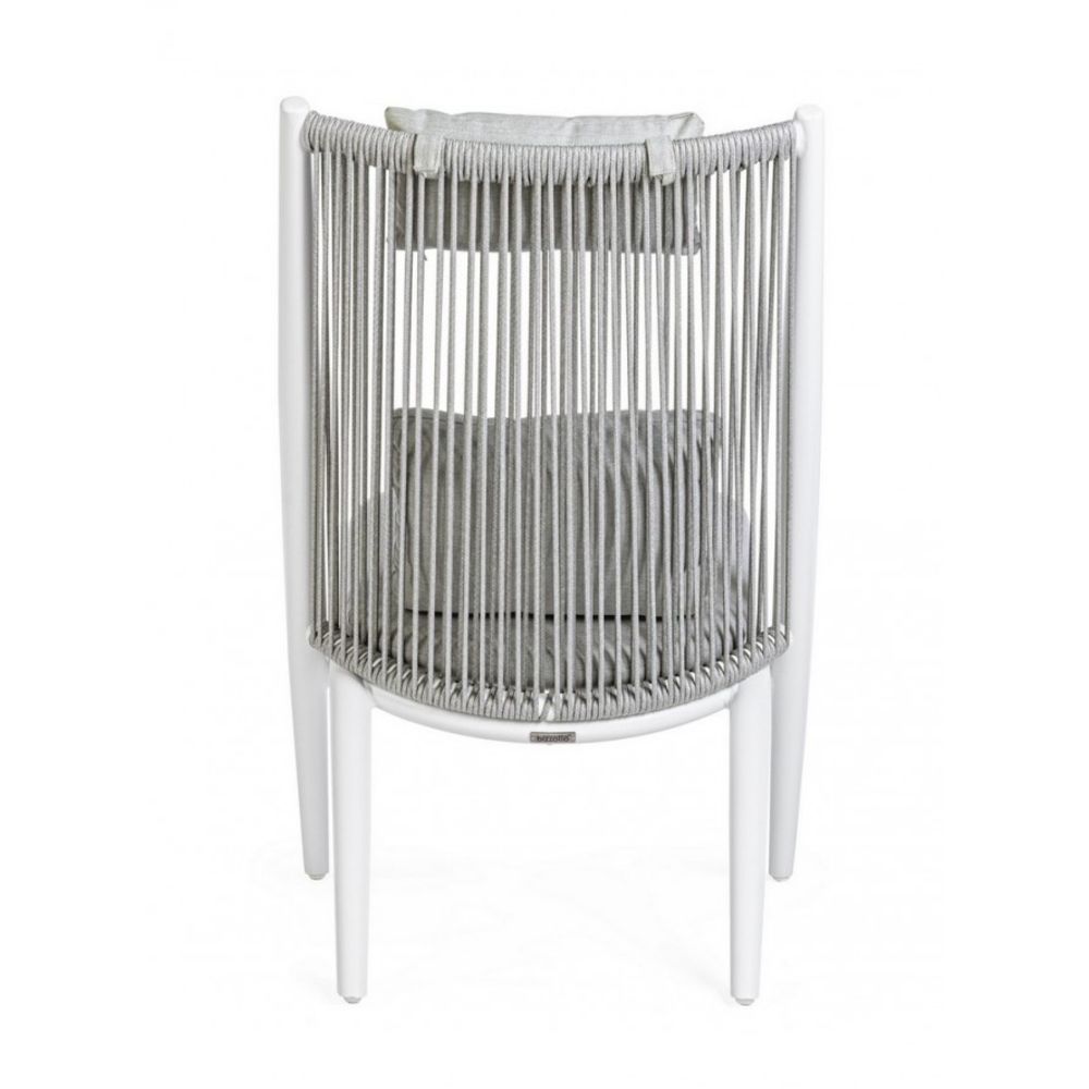 La sua struttura è realizzata in alluminio verniciato a polvere di poliestere bianco. L’intreccio di corde in poliestere, idrorepellenti e trattate per resistere ai raggi UV, crea un effetto visivo elegante e garantisce particolare resistenza agli agenti atmosferici.
