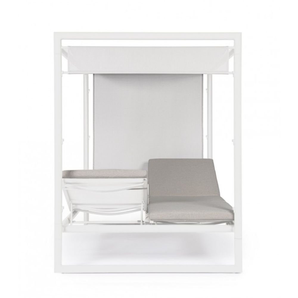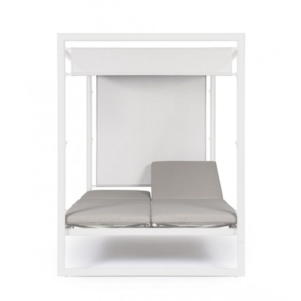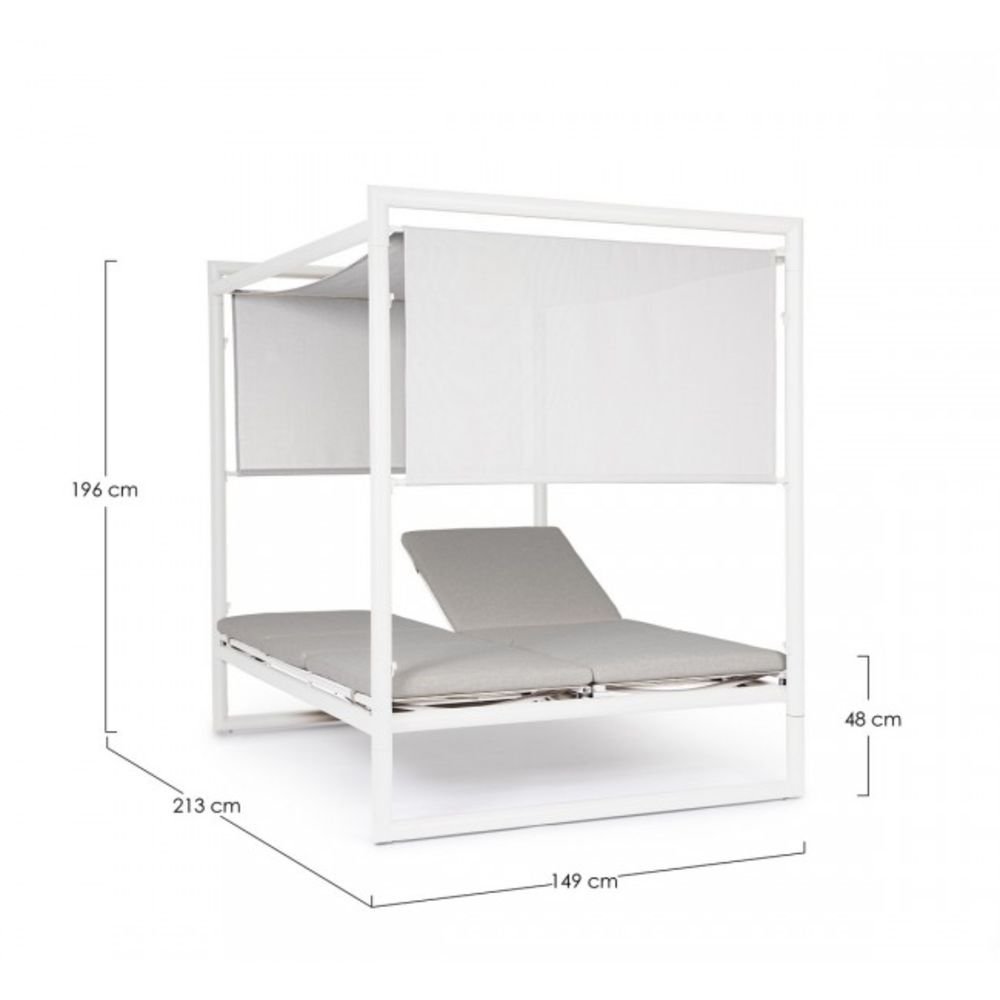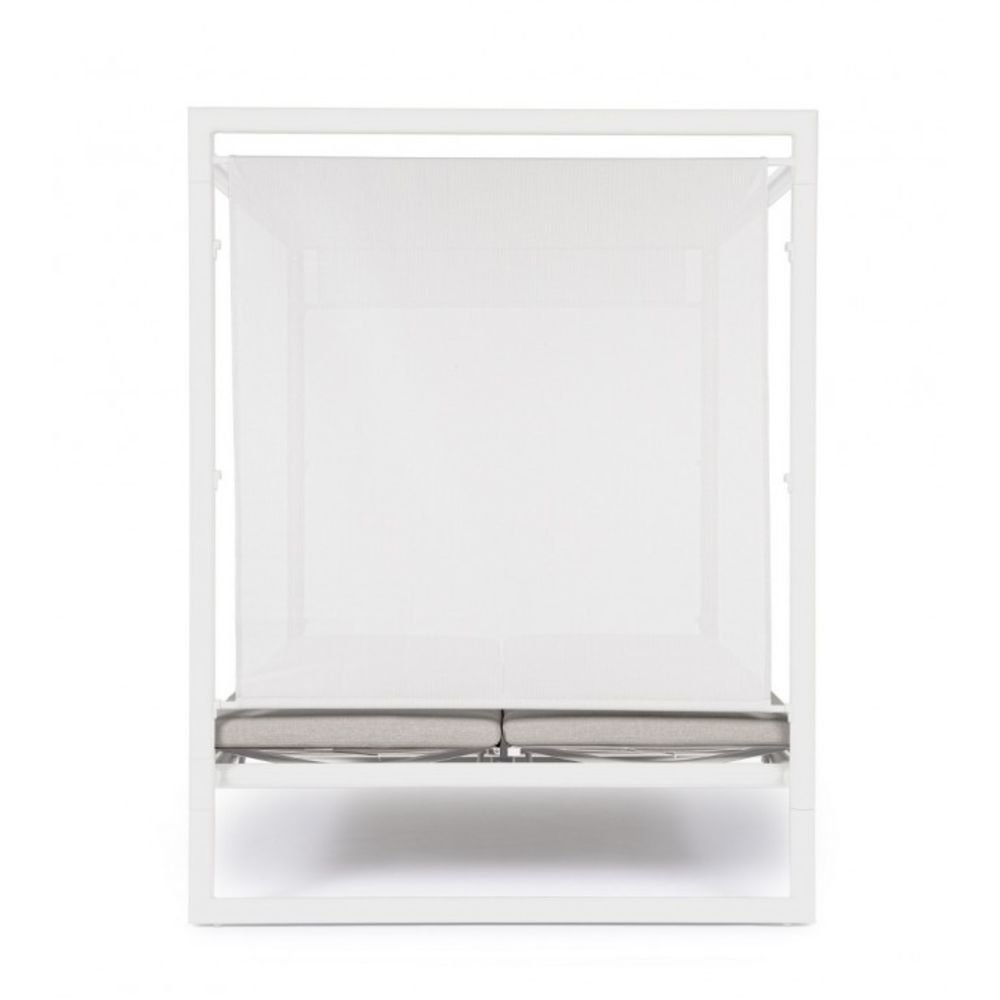 Sulla struttura a baldacchino, in alluminio bianco, poggiano due lettini adiacenti costituiti da cuscini imbottiti color tortora. Tali cuscini sono sfoderabili e realizzati in tessuto idrorepellente Olefin, un materiale in polipropilene che si distingue per la sua resistenza all’acqua e la facile manutenzione.